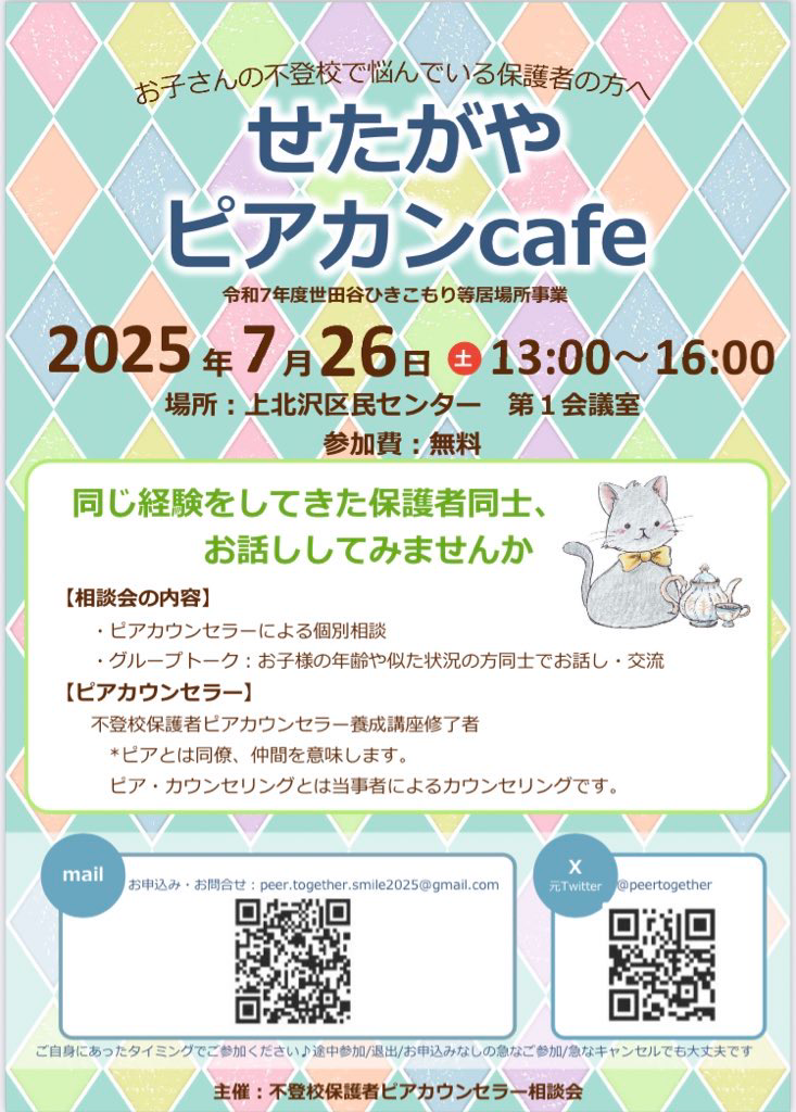 ※不登校保護者ピアカウンセラー相談会から「せたがやピアカンcafe」に名称変更しました。