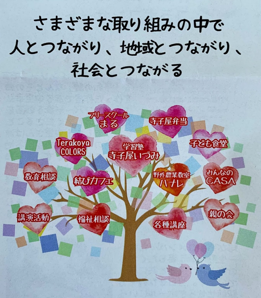 一般社団法人寺子屋いづみは、1983年から世田谷で「学習塾寺子屋」を運営されてきた岩岡いづみさんが代表を務める法人です。深沢地区に世田谷教室を構え、夕方の時間帯には「学習塾寺子屋」や子ども食堂、昼間には「フリースクールまる」を開くほか、様々な形で地域の子ども・若者の学びや成長を支える活動を行っています。例えば、次のような取り組みがあります。