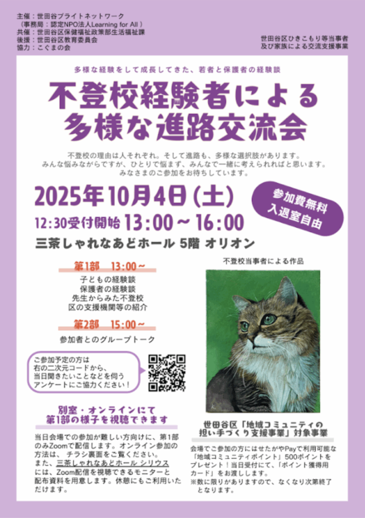 2025年10月4日(土)、三茶しゃれなあどホールで「不登校経験者による多様な進路交流会」が開催されました。子どもや保護者、不登校を経験した子どもを支える学校の先生などが登壇し、それぞれの立場から経験や思いを語りました。この記事では、当日の様子をお伝えします。