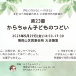 イベントカテゴリ: 子ども向け過去のイベント →← 新しいイベント 居場所TIME 2026年4月29日 15:00 – 18:00 カテゴリ: 子ども向け ボードゲームNight 2026年5月1日 15:00 – 18:00 カテゴリ: 保護者向け, 子ども向け 居場所TIME 2026年5月6日 15:00 – 18:00 カテゴリ: 子ども向け ボードゲームNight 2026年5月8日 15:00 – 18:00 カテゴリ: 保護者向け, 子ども向け 居場所TIME 2026年5月13日 15:00 – 18:00 カテゴリ: 子ども向け ボードゲームNight 2026年5月15日 15:00 – 18:00 カテゴリ: 保護者向け, 子ども向け 居場所TIME 2026年5月20日 15:00 – 18:00 カテゴリ: 子ども向け ボードゲームNight 2026年5月22日 15:00 – 18:00 カテゴリ: 保護者向け, 子ども向け 居場所TIME 2026年5月27日 15:00 – 18:00 カテゴリ: 子ども向け からちゅん子どものつどい 2026年5月29日 14:00 – 17:00 カテゴリ: 子ども向け過去のイベント →← 新しいイベント