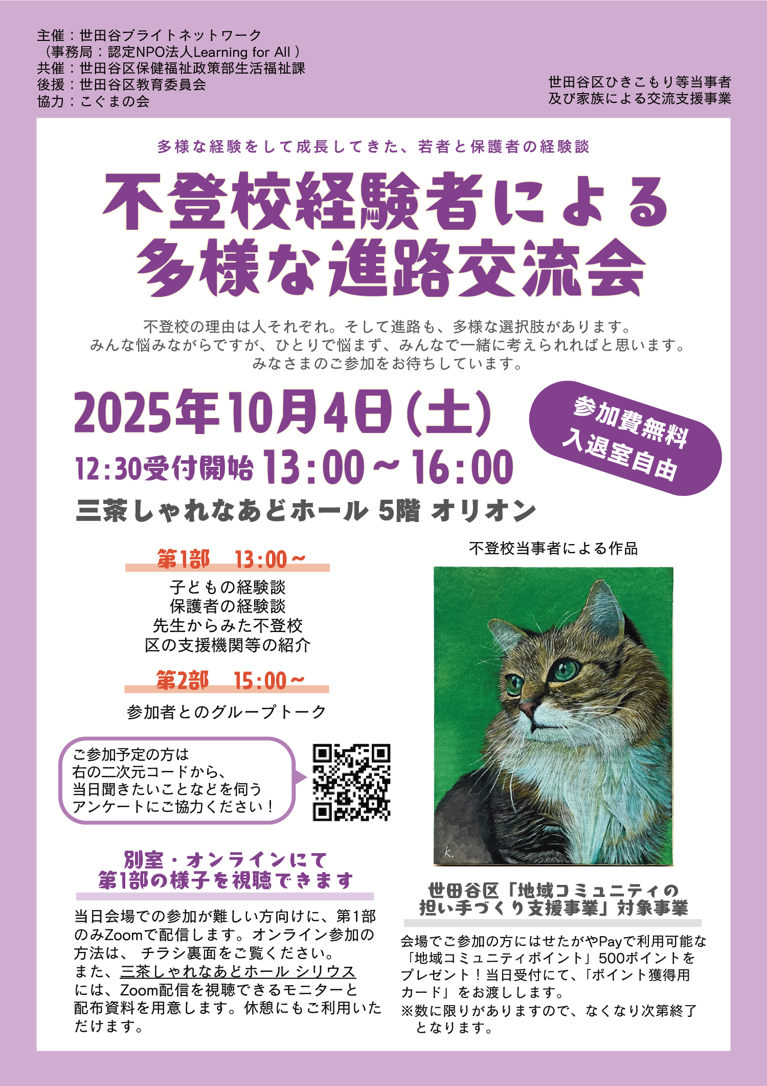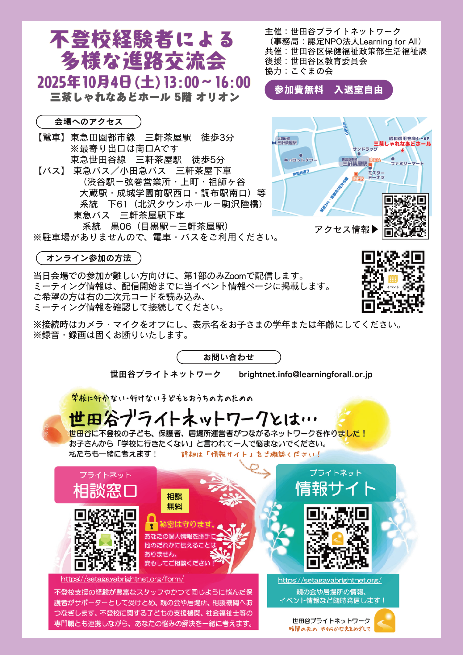 進路だけでなく、多世代、多様な悩みについて、みんな話せたらと思っています。 いろいろな方にご参加いただき、当事者のリアルなお話をお聞きいただければと思います。