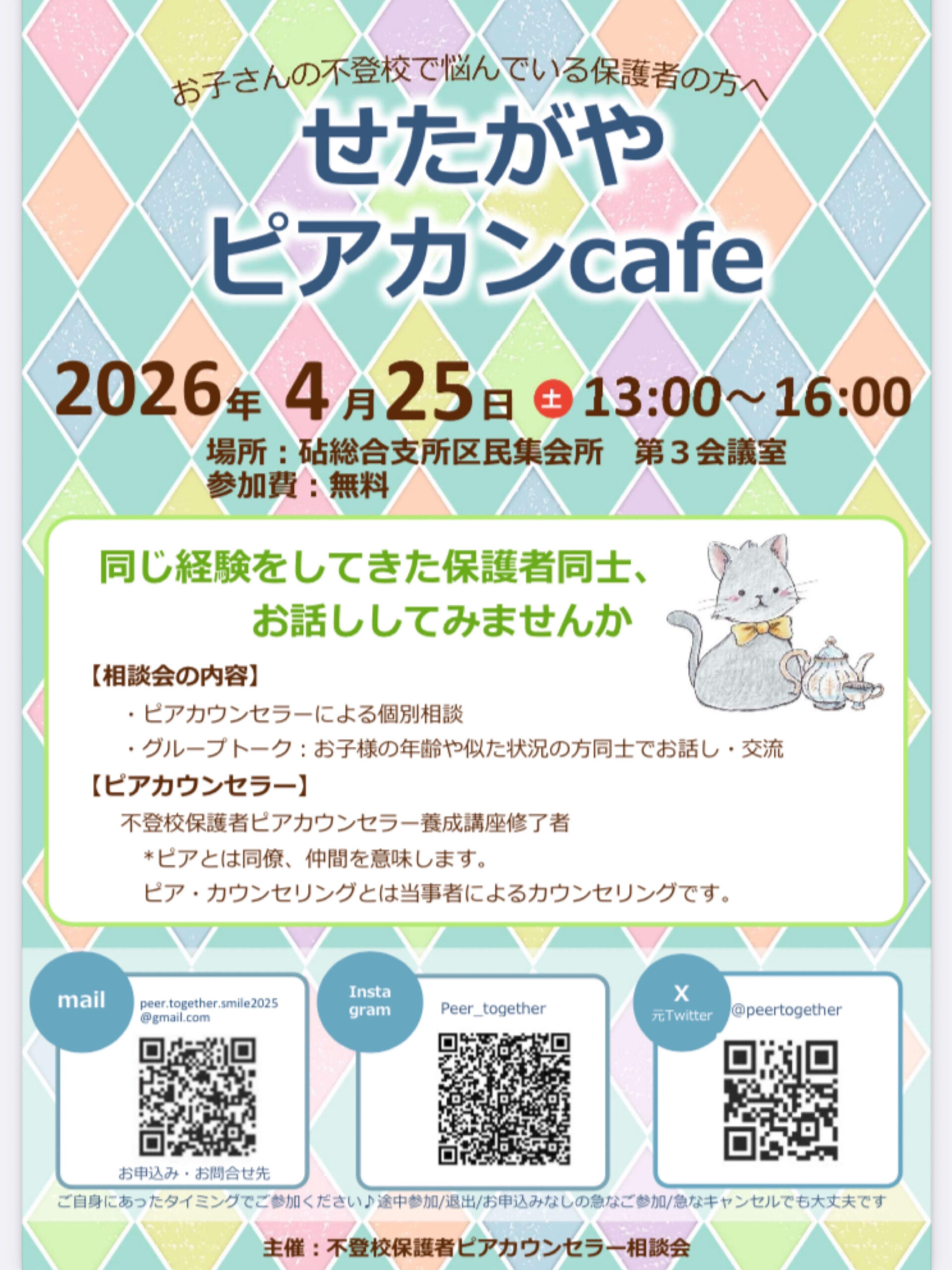 ※不登校保護者ピアカウンセラー相談会から「せたがやピアカンcafe」に名称変更しました。