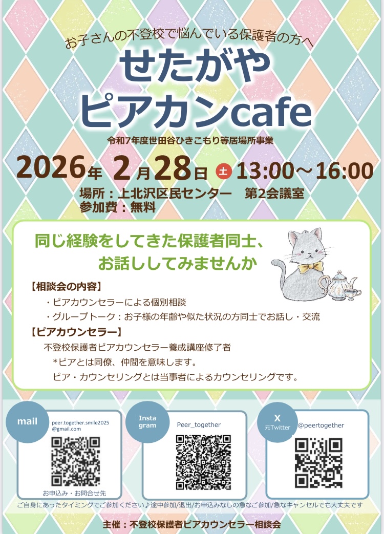 ※不登校保護者ピアカウンセラー相談会から「せたがやピアカンcafe」に名称変更しました。