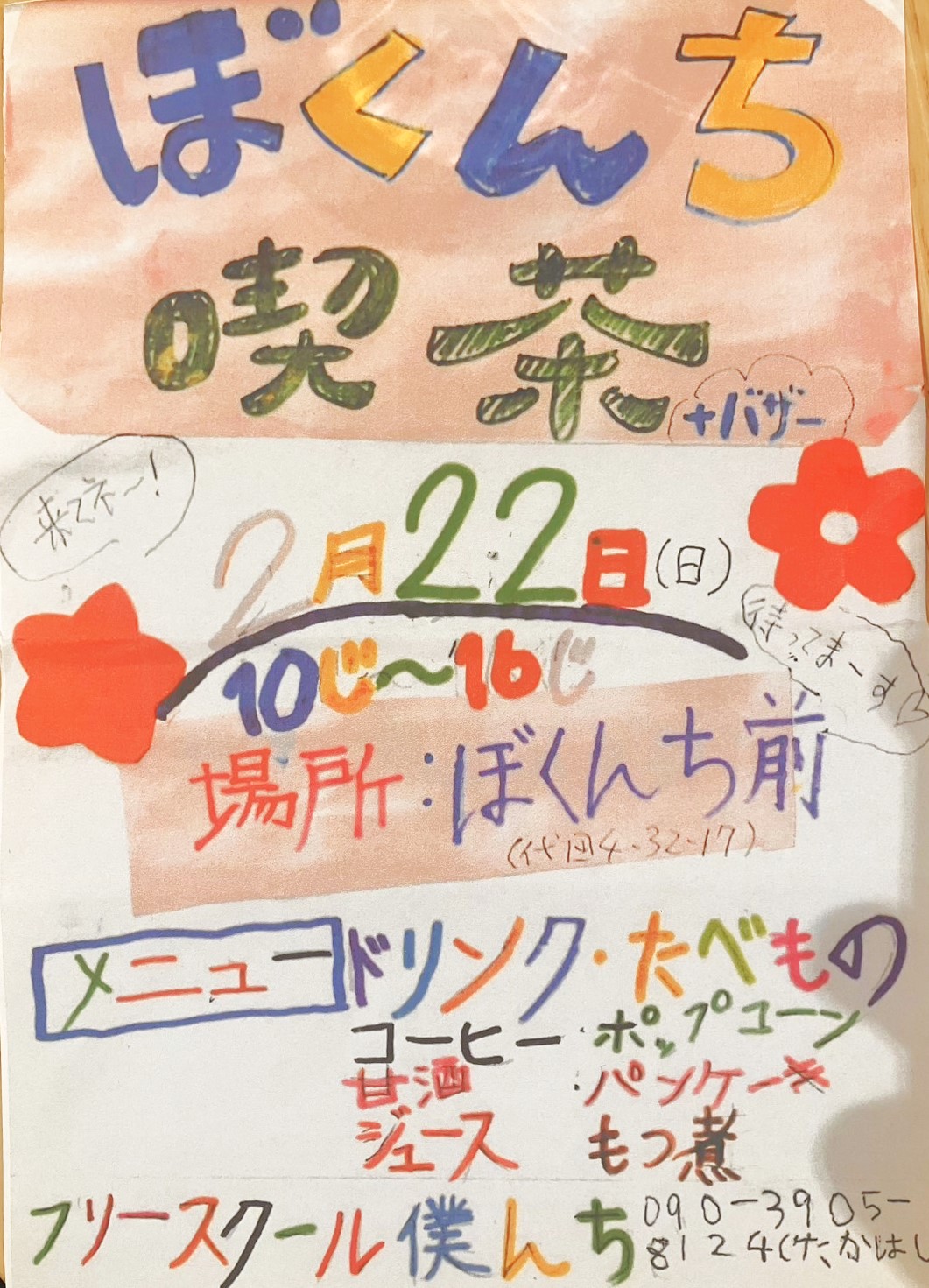 フリースクール僕んちの玄関前路地と1階フロアで、喫茶+バザーを開催します!