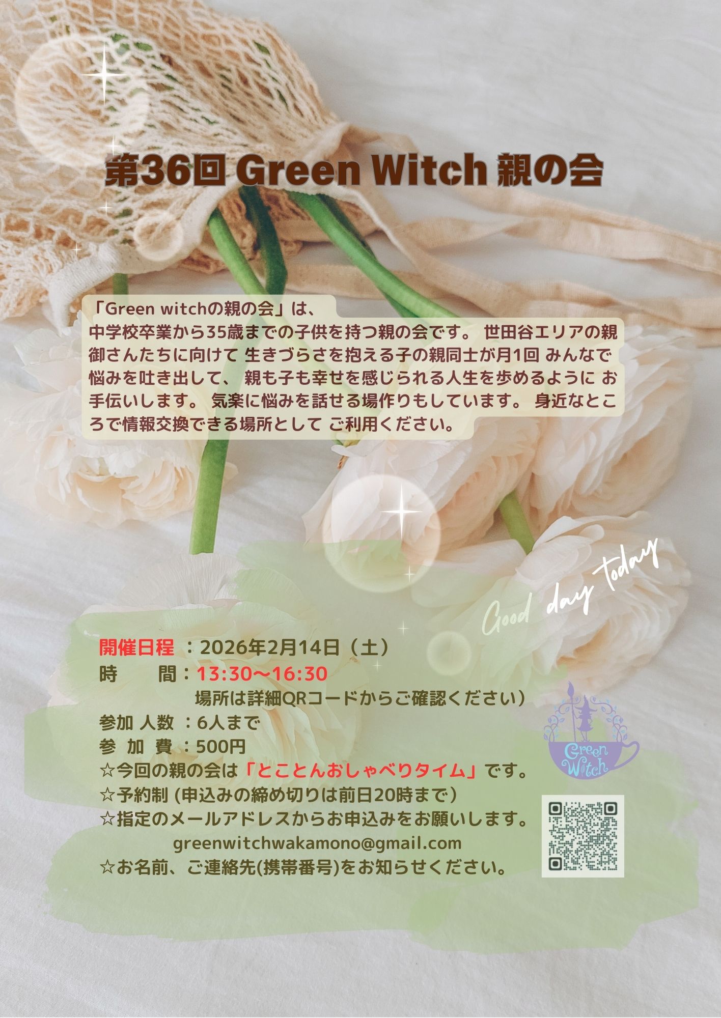 「Green witchの親の会」は、 中学校卒業から35歳までの子供を持つ親の会です。 世田谷エリアの親御さんたちに向けて、生きづらさを抱える子の親同士が 月1回みんなで悩みを吐き出して、親も子も幸せを感じられる人生を歩めるようにお手伝いします。気楽に悩みを話せる場作りもしています。身近なところで情報交換できる場所としてご利用ください。